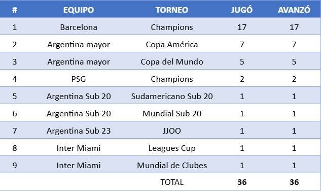 梅西延续了自己职业生涯小组赛全部晋级的铁律,阿根廷媒体统计了梅西生涯共36次小组赛晋级的分布情况,包含33次成年比赛晋级以及3次国奥队&U-20赛事晋级。